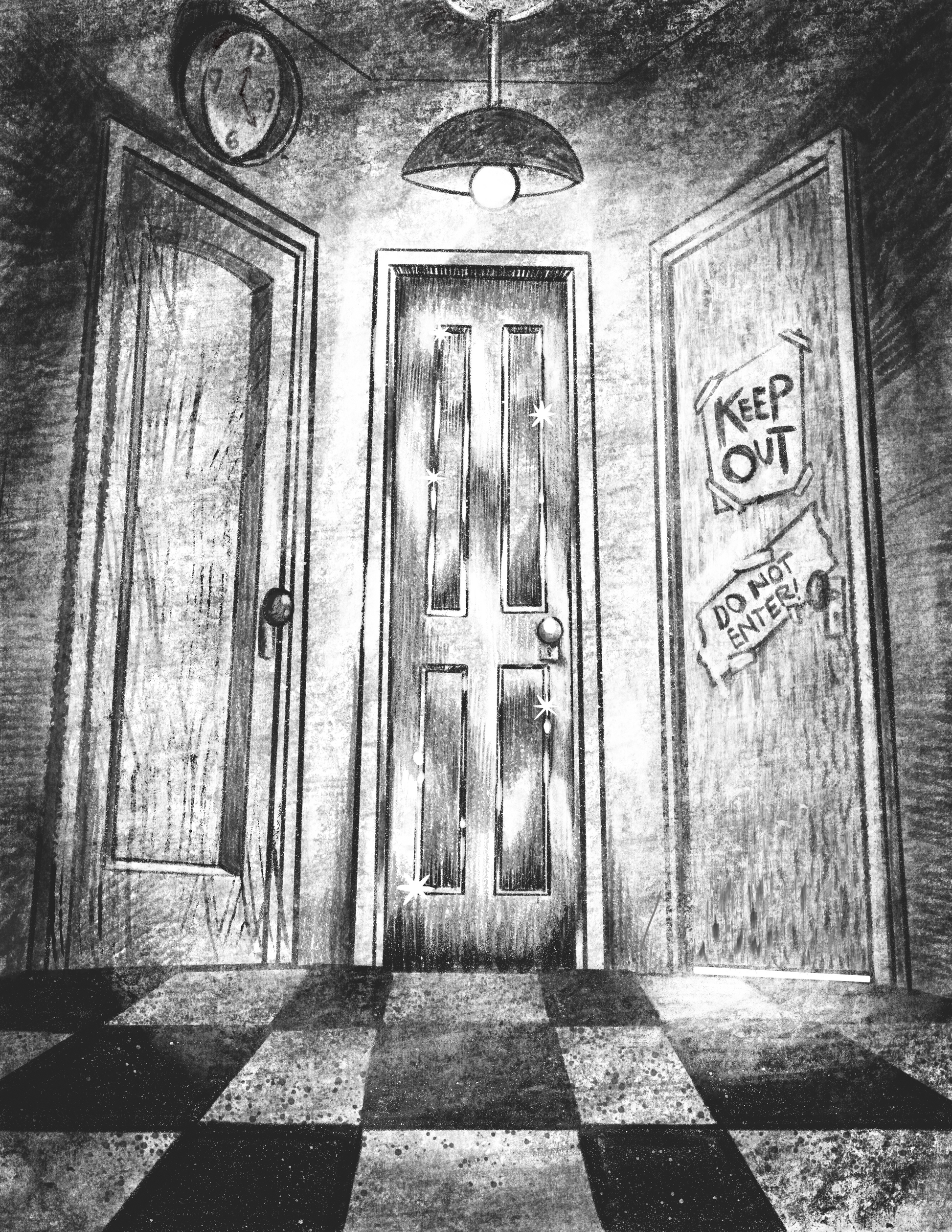 And it all starts, as many creative adventures do, in the art room with three mysterious doors. One door looks to be carved out of pure gold as it sparkles and shines under a dim light. Another is old and battered and covered in signs that warn you to 'Keep Out!' and 'Stay away!' And the third door looks normal enough...except for the clock that hangs above whose hands seem to be spiraling out of control. What could possibly be behind these mysterious doors?