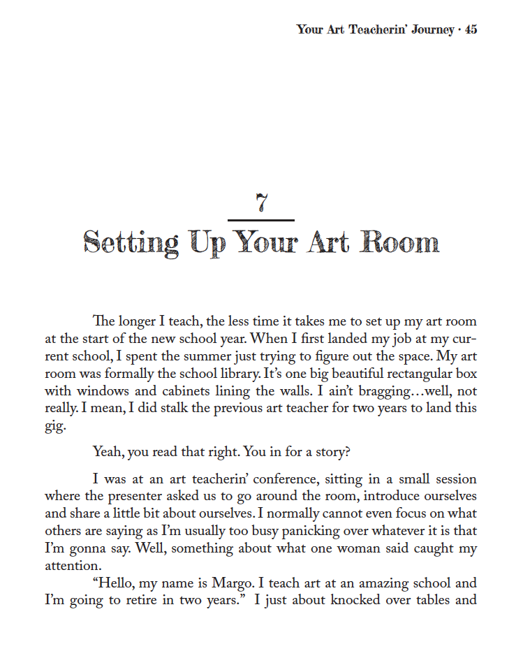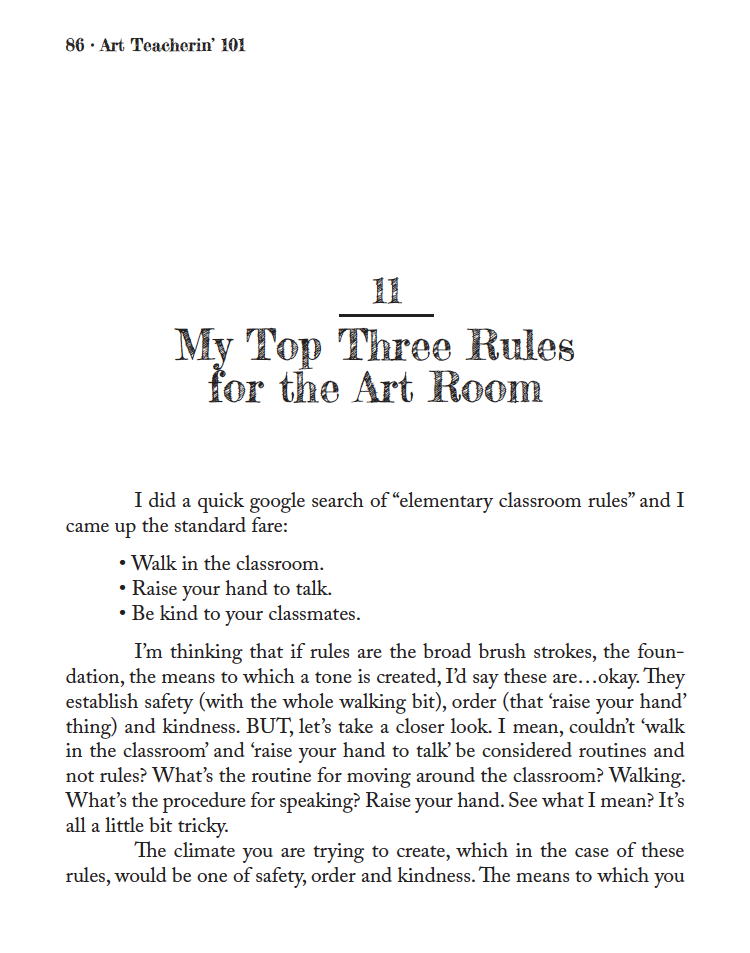 You have definitely helped my teaching in just a few short weeks. I organized better and the students have actually thanked me for teaching as they were going out the door. Your book is easy to read and sometimes I find myself laughing out loud. I have definitely felt like I was on my lonely island in Art land and you have helped me relax and my students are loving the new strategies I have learned from you.